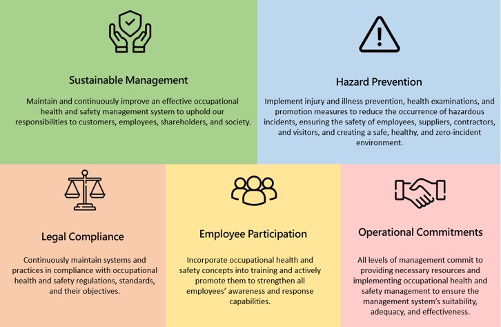 The company adopted ISO 45001 procedures in 2023 and obtained IAS (USA) certification in 2024, valid through December 2027. Annual surveillance and triennial recertification audits ensure continuous improvement. Through internal management, training, and awareness programs, the company strengthens stakeholders’ understanding of occupational safety and health responsibilities and rights, thereby reducing risks.