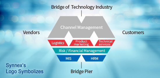 This logo accurately expresses the business philosophy of SYNNEX, the essence of the distributor is to serve as a bridge between vendors and customers, and the operation of the business must rely on the support of other departments, otherwise it is easy to collapse. SYNNEX has established a management model based on a matrix-functional organization, emphasizing teamwork and specialized authorization ,to lay a solid foundation for the bridge of technology.​