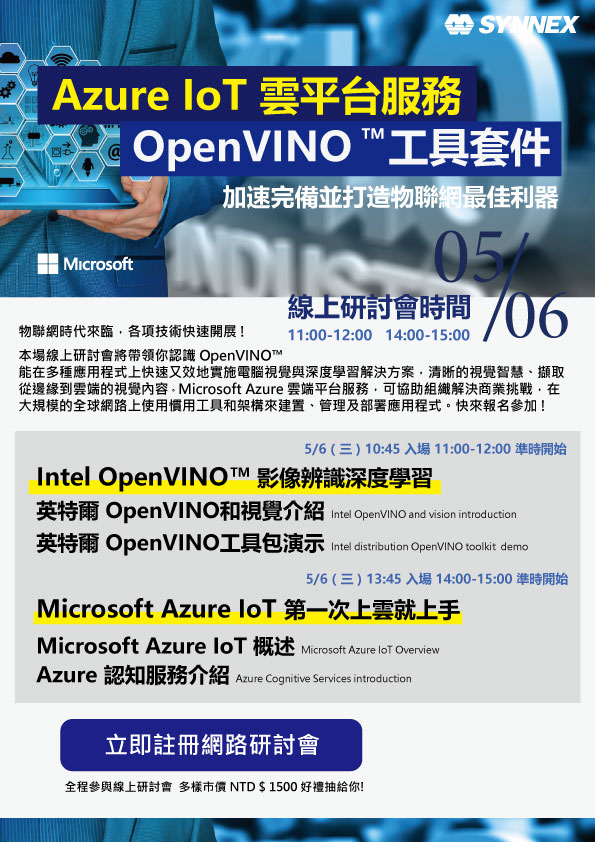 好奇Azure IoT 雲平台服務 & OpenVINO™工具套件是什麼,卻無認識起嗎? 本場線上研討會將帶領你認識 OpenVINO™ 能在多種應用程式上快速又效地實施電腦視覺與深度學習解決方案,清晰的視覺智慧、擷取從邊緣到雲端的視覺內容。Microsoft Azure 雲端平台服務,可協助組織解決商業挑戰,在大規模的全球網路上使用慣用工具和架構來建置、管理及部署應用程式。快來報名參加 !
