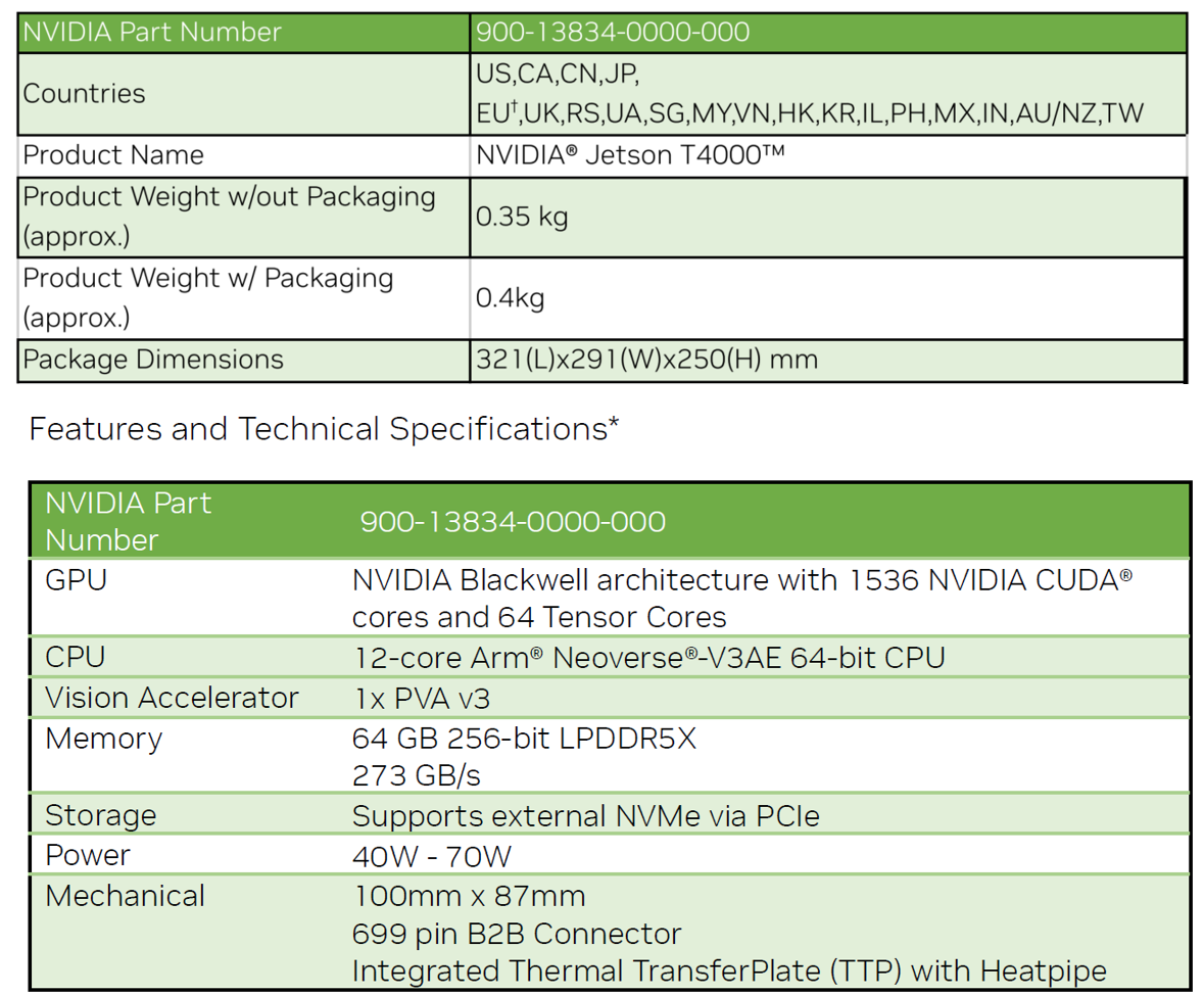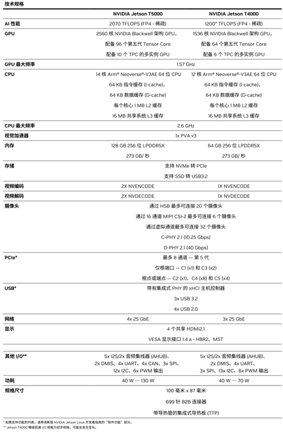 该模组系统 (SoM) 采用 NVIDIA Blackwell 架构 GPU,配备新的 Transformer引擎,并且支持多实例 GPU (MIG),能够轻松运行最新的生成式 AI 模型。NVIDIA Jetson Thor T4000配备 12 核 Arm® Neoverse®-V3AE CPU,采用 3x 25GbE 网络技术,并且提供用于实现传感器融合的广泛 I/O 选项,因此能够提升低延迟实时多传感器应用的速度。它还包含一套加速器,其中包括一个第三代可编程视觉加速器 (PVA)、一个编码器和解码器、一个光流加速器等。