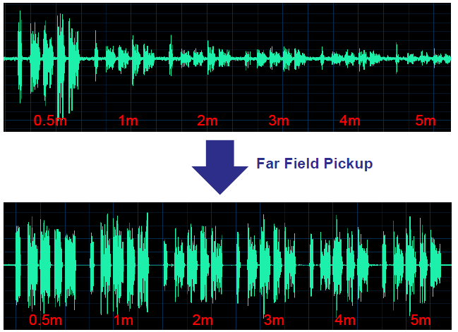 這個功能其實是將收到的語音訊號能量做一個計算,當能量過大時就會將Gain調低(音量降低)相反的當能量較小時就會將Gain增加(音量放大)以此來讓收到的語音訊號保持在一定的大小,這樣一來使用者不論距離語音裝置遠或近都可以有良好的語音辨識效果。下圖就是語音訊號經過處理的效果