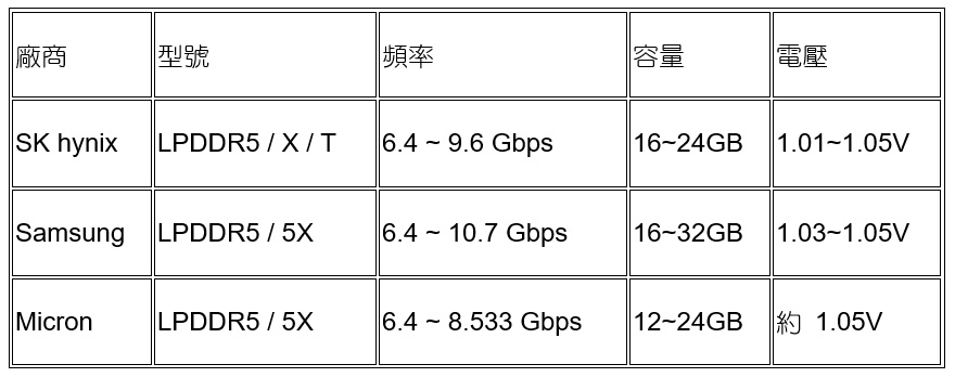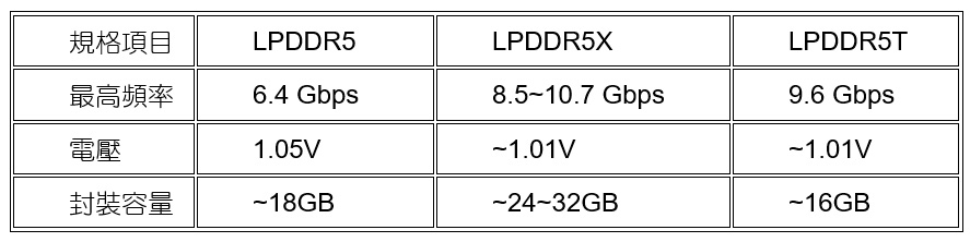 • LPDDR5X / 5T 提供更高頻寬與低功耗支援