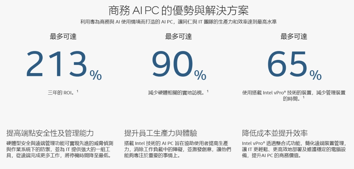 • Intel vPro 平台是一個可靠的企業級平台,協助 IT 管理人員在資訊安全與維護管理上有效管理終端使用者的電腦設備,同時幫助企業以更少的中斷時間維持設備正常運作。