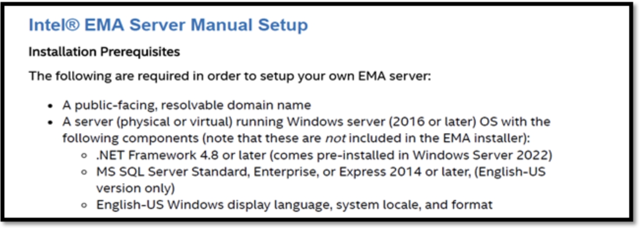 • Intel EMA Server : AMT & ISM的管理平台,建議Windows Server 2022或更新版本安裝使用。