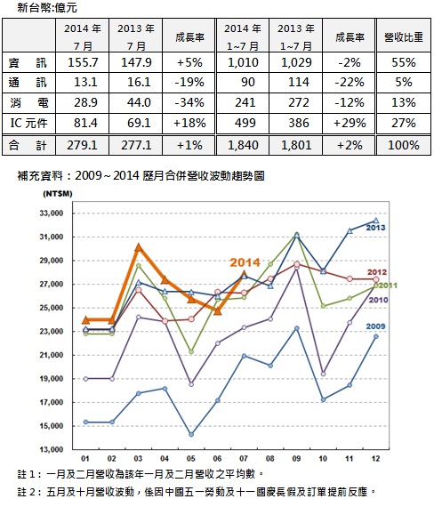 依產品別,資訊產品七月份的營收為155.7億元,較去年同期的147.9億元成長5%。累計前七個月的營收為1,010億元,較去年同期的1,029億元下滑2%,資訊產品佔總營收的比重為55%。