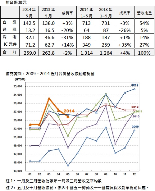 IC元件的營收為71.2億元,較去年同期的62.7億元成長14%。累計前五個月的營收為349億元,較去年的259億元成長35%,IC元件佔總營收的比重為27%。(詳見附表說明)