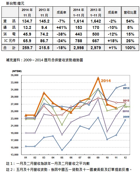 IC元件的營收為65.9億元,較去年同期的86.7億元減少24%。累計前十一個月的營收為788億元,較去年的667億元成長18%,IC元件佔總營收的比重為26%。 (詳見附表說明)